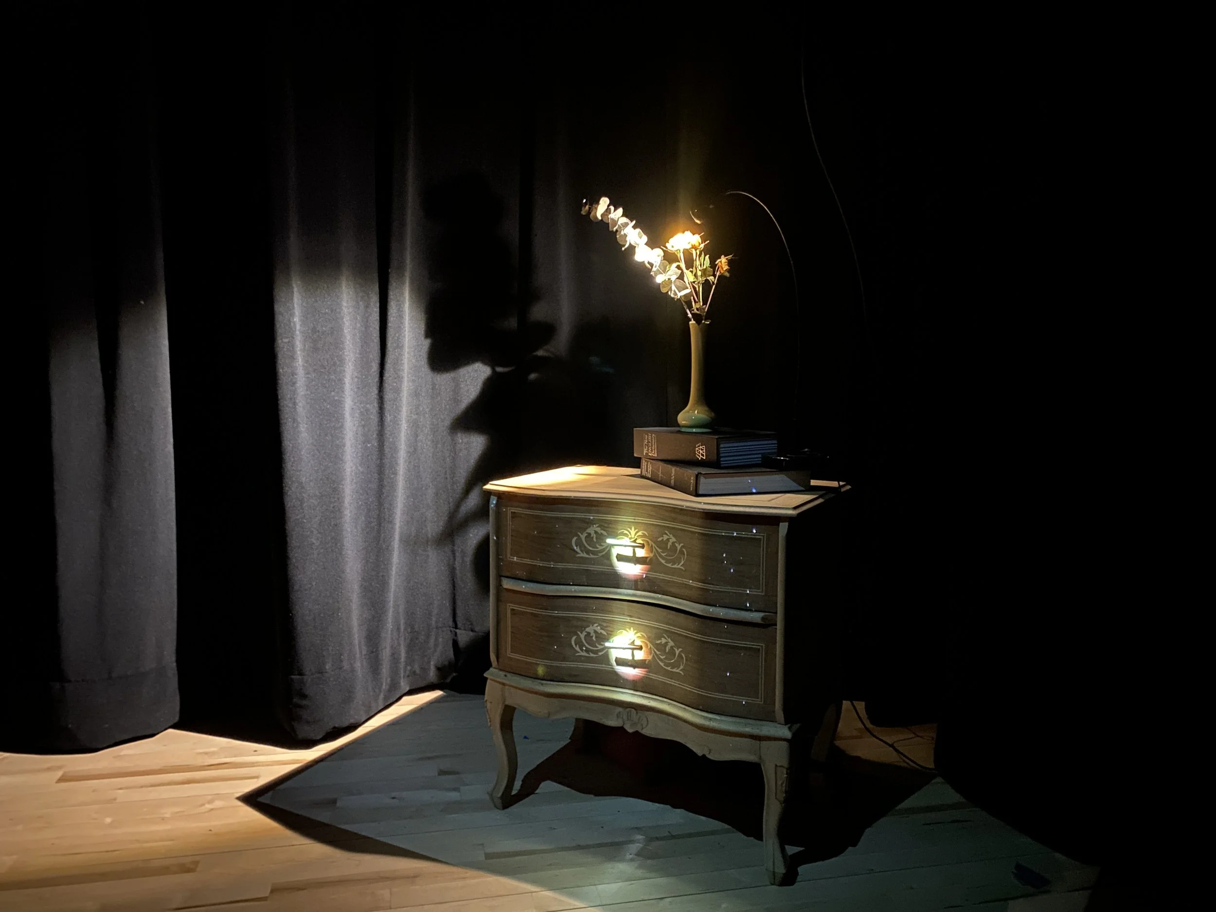 Inspired by the traditional paper theater, me and Zeshu were thinking of placing a theater as a fantasy world inside a cabinet. Considering the best projection and interaction effect, we decided to use this drawer as a holder for this theater. Drawers are very ordinary everyday objects, but having this quality of the unknown inside, can trigger the audience with their natural curiosity.